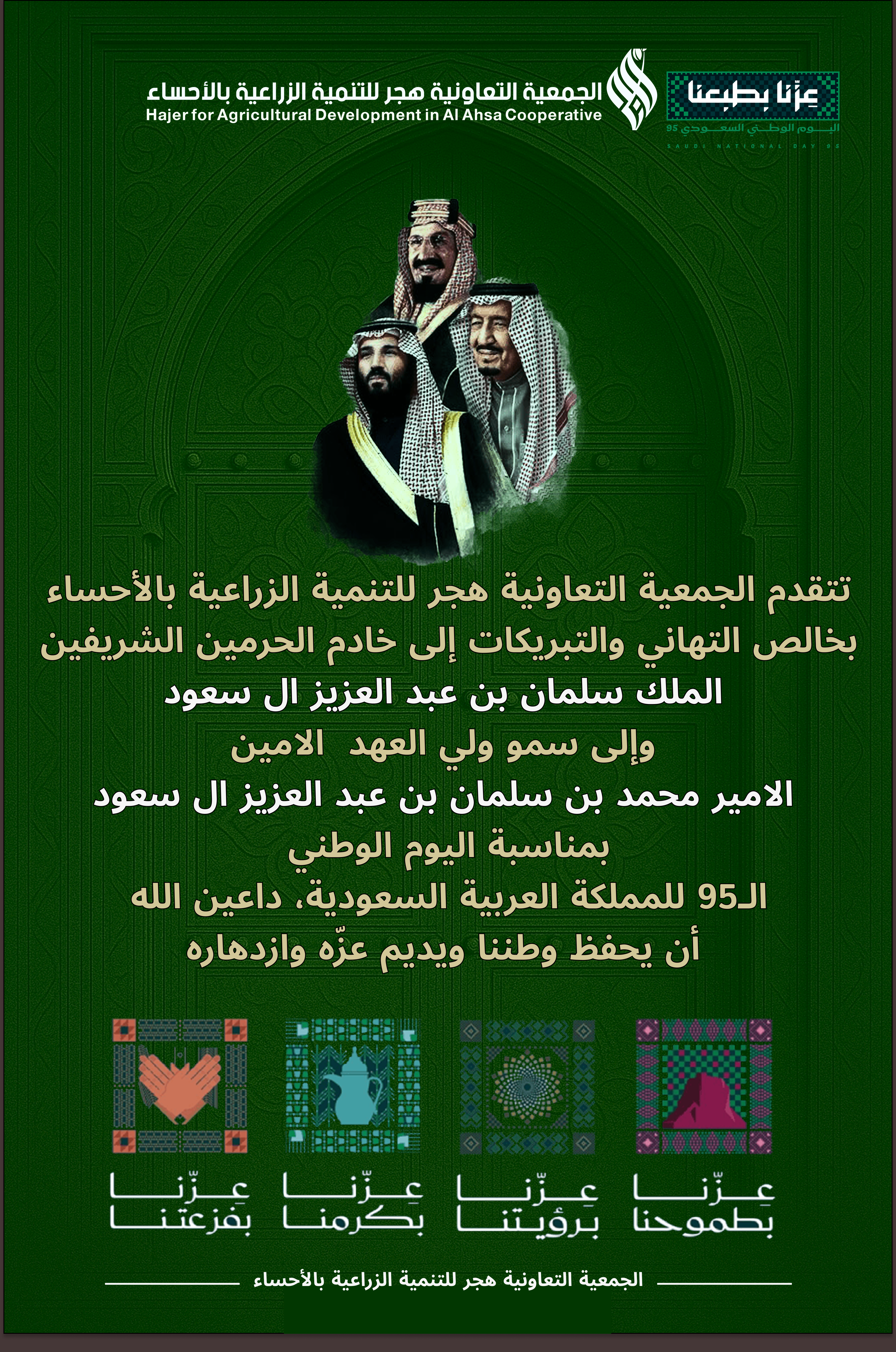 تتقدم الجمعية التعاونية هجر للتنمية الزراعية بالأحساء بخالص التهاني والتبريكات إلى خادم الحرمين الشريفين الملك سلمان بن عبد العزيز ال سعود وإلى سمو ولي العهد الامين الامير محمد بن سلمان بن عبد العزيز ال سعود بمناسبة اليوم الوطني ال95 للمملكة العربية السعودية، داعين الله أن يحفظ وطننا ويديم عزّه وازدهاره